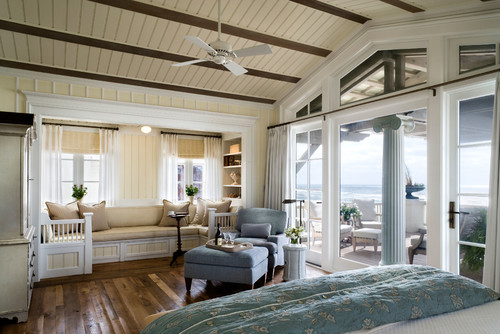 Photo by Gary Brewer Robert A.M. Stern Architects - ابحث عن المزيد من ديكورات غرف النوم ديكور غرفة نوم شاطئية بجدران صفراء وارضية باركيه ذات لون داكن واطلالة مميزة على البحر.